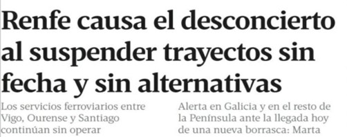 N.B.: Y, a fuer de ser sincero, hay que contarlo todo: hace apenas unos días, RENFE canceló (en contra de la opinión de ADIF; o sea: la mano derecha y la izquierda del Ministerio de Fomento, del todo descoordinadas) durante varias jornadas todos los trenes con origen/destino Vigo, sin establecer autobuses alternativos… ¡¡¡No!!!! Eso no es un servicio público: eso es dejar tirada -además, sin previo aviso- a la ciudadanía. Sin más. Infumable, inolvidable, imperdonable.